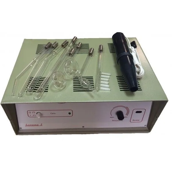 - Представляет собой генератор высокочастотных импульсно-модулированных колебаний, на выходе которого включен резонатор (повышающий трансформатор), питающий высоким напряжением стеклянные вакуумные электроды различной формы, обеспечивающие применение местной дарсонвализации;