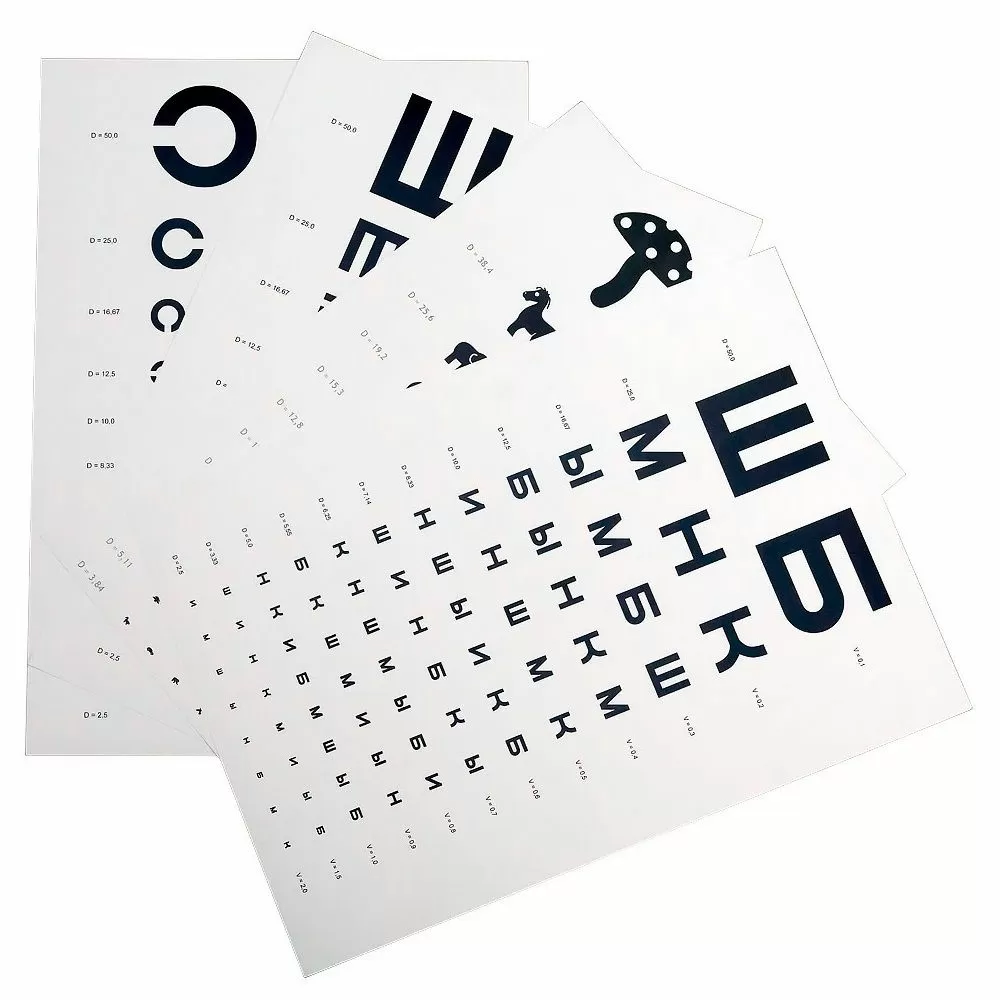 В комплект входят пять различных таблиц для проверки зрения: