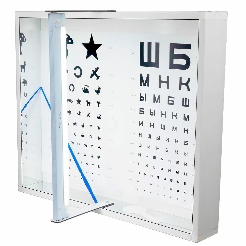 Осветитель таблиц российского производства выполнен в пластиковом корпусе, внутренний периметр которого, снабжен зеркальные отражатели. Внутри, на задней стенке корпуса закрепляются таблицы для проверки остроты зрения.