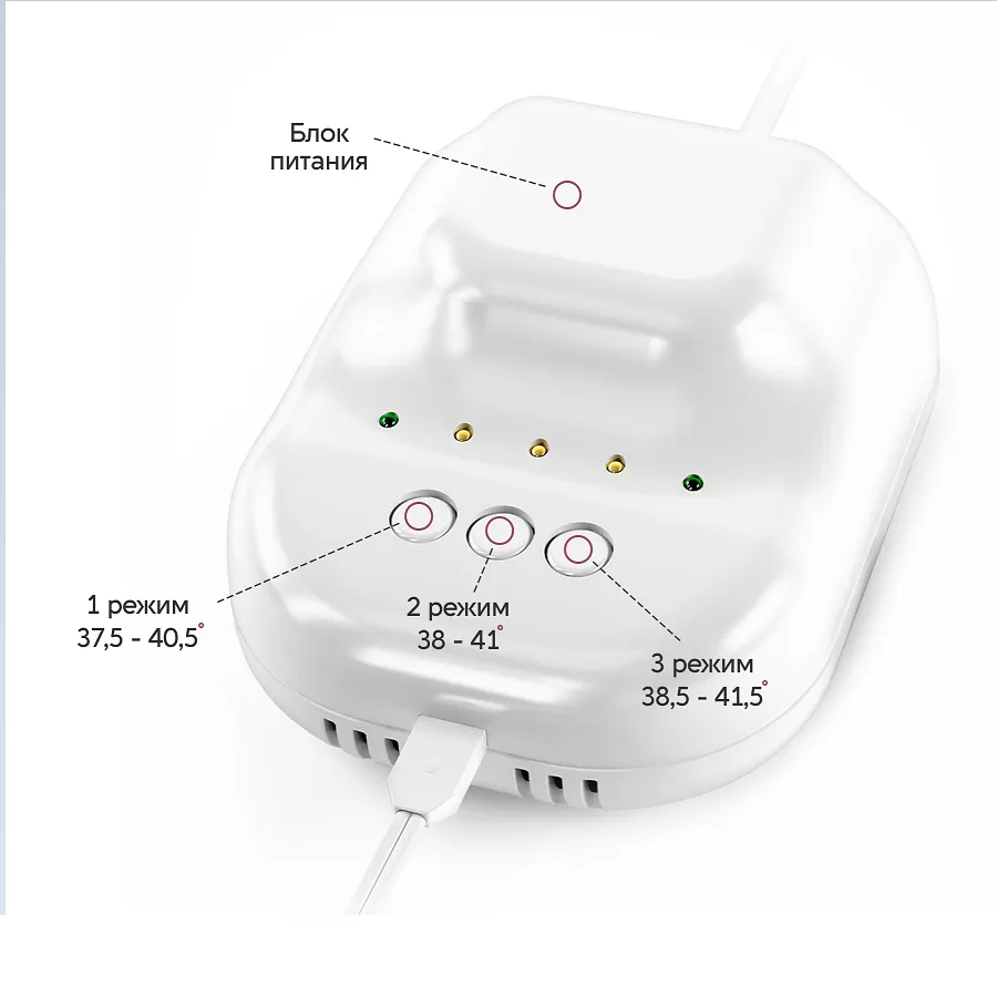 источник питания устройства – IP2Х зонд термомагнитный – IP42 по ГОСТ 14254 IP2X – источник питания защищен от попадания посторонних предметов диаметром более 12,5 мм IP42 – зонт термомагнитный с кабелем пациента защищен от попадания посторонних предметов диаметром более 1 мм и вертикально падающих капель воды при наклоне корпуса на 15° |