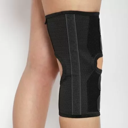 - Бандаж выполнен из перфорированного материала, имеет усиленные полукольца для коленной чашечки, обработанные мягким материалом
