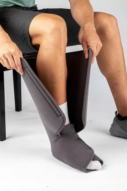 • В комплект входят две пластины для иммобилизации большеберцовой кости и икроножной мышцы, а также предусмотрены дополнительные уплотняющие пелоты для регулировки внутреннего объема и лучшей стабилизации ноги в ортезе и защитный чехол для пальцев стопы, который можно снять для дополнительной вентиляции.