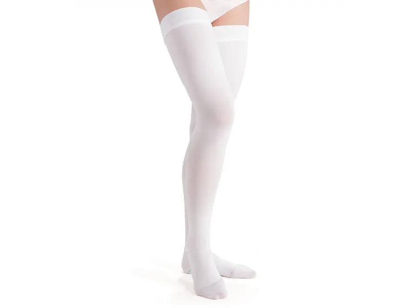 Широкая силиконовая резинка в области верхней трети бедра не оказывает чрезмерного давления на подлежащие ткани, а отверстие расположенное под дистальным отделом стопы способствует эффективному воздухо- и влагообмену. Антиэмболический трикотаж применяется по рекомендации лечащего врача и не рассчитан на длительную ходьбу, основная задача – нормализация венозного кровотока у пациентов с предписанным постельным режимом.