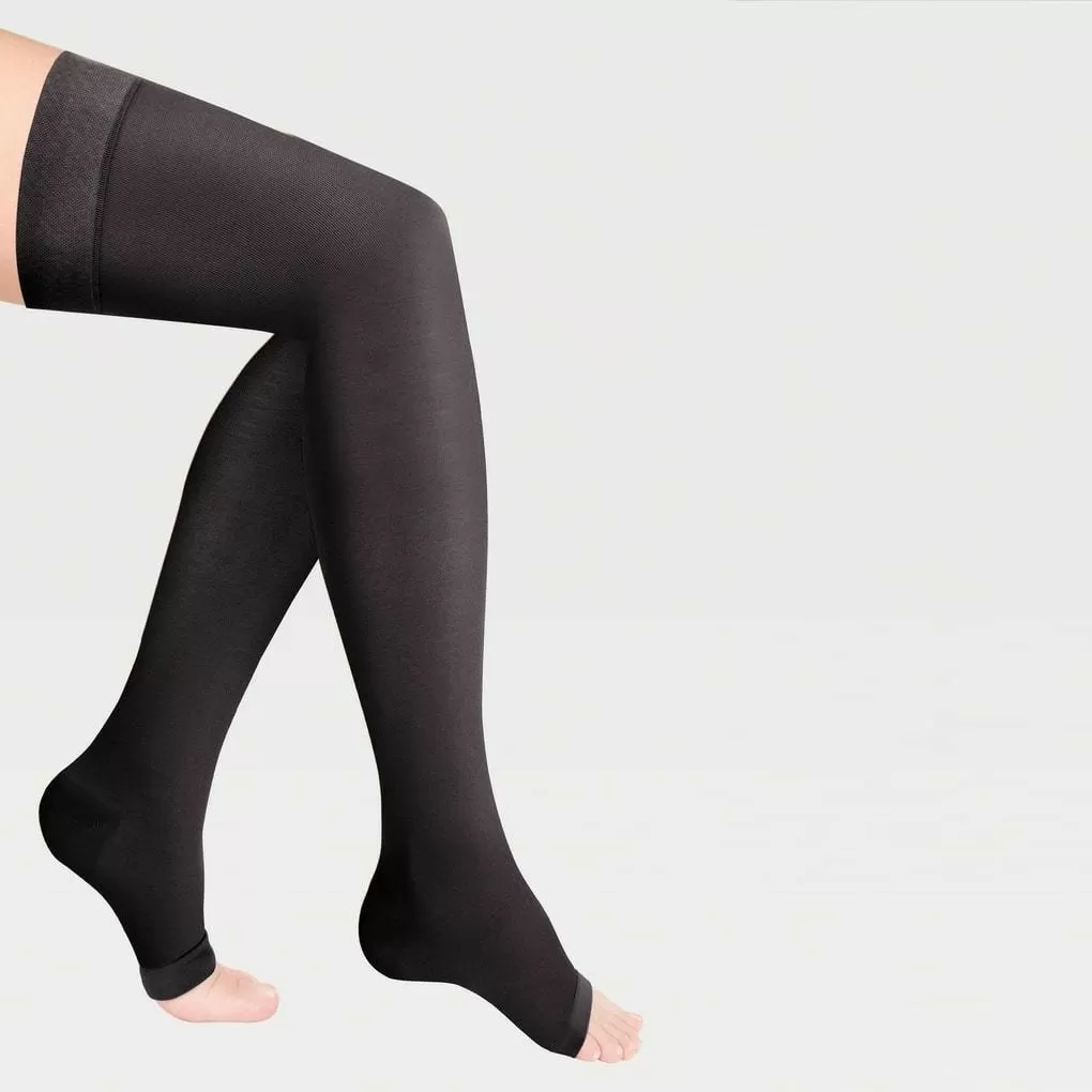 - резинка на силиконовой основе, в том числе на широкое бедро, мягко фиксирует чулок , не нарушая кровотока