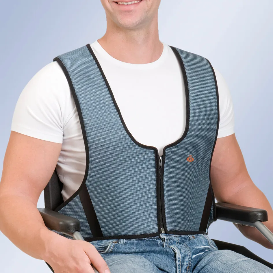 Изготовлен из неопрена. К нижней части жилета прикреплены ремешки с бегунками, регулирующие их длину. К креслу жилет крепится с помощью винта и отверстия, расположенного на одном конце. На другом конце есть пряжка для быстрого крепления. В центральной части жилета - молния.