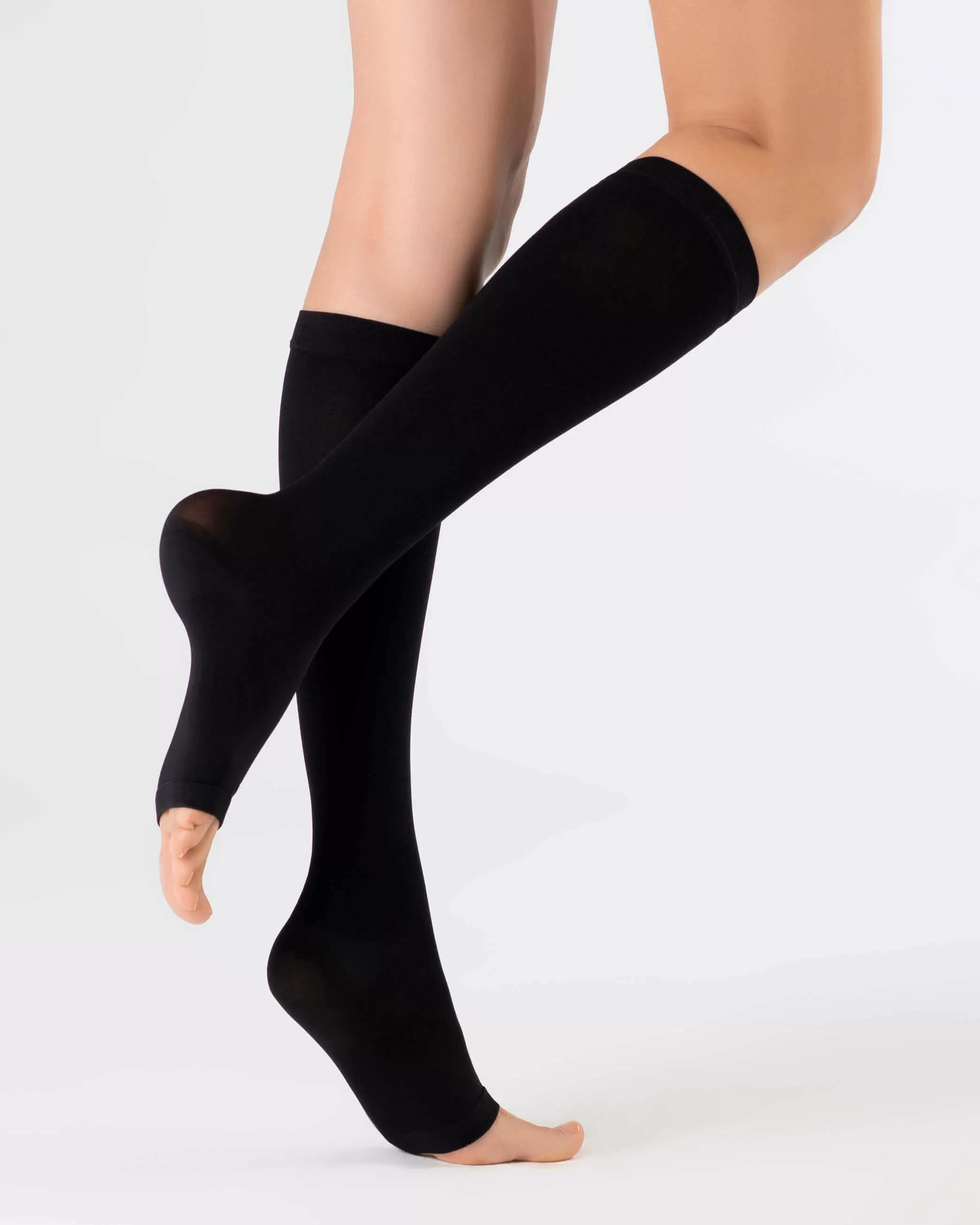 - В комплекте к трикотажу с открытым мысом идет шелковистый носочек для облегчения надевания.