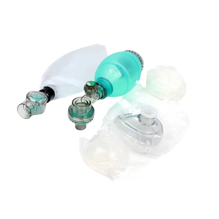- В комплект входят: мешки вентиляционный 500 мл и дополнительный 600 мл, клапан пациента и выпускной клапан, маски дыхательные № 2 и 3, кислородная трубка, сумка для хранения