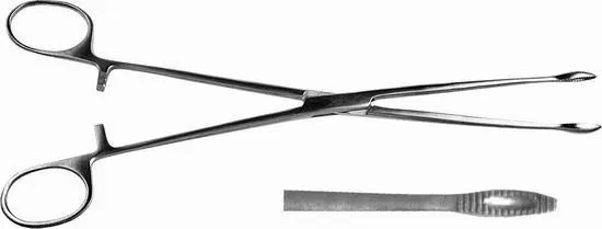 Хирургический инструмент для захватывания и подачи стерильных инструментов и перевязочного материала, представляющий собой зажим с кремальерой, длинными прямыми или изогнутыми браншами и овальными губками с насечкой.