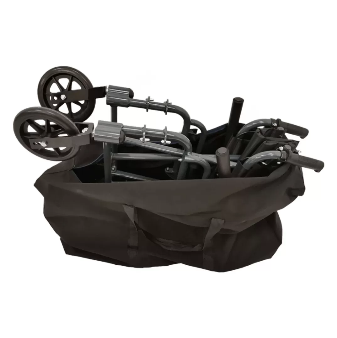 Рама каталки складывается "сторона к cтороне" и оборудована складной спинкой для максимально компактного сложения при транспортировке. Поднимающиеся подлокотники из алюминиевой трубы, покрытой мягким пористым пенополиуретаном.