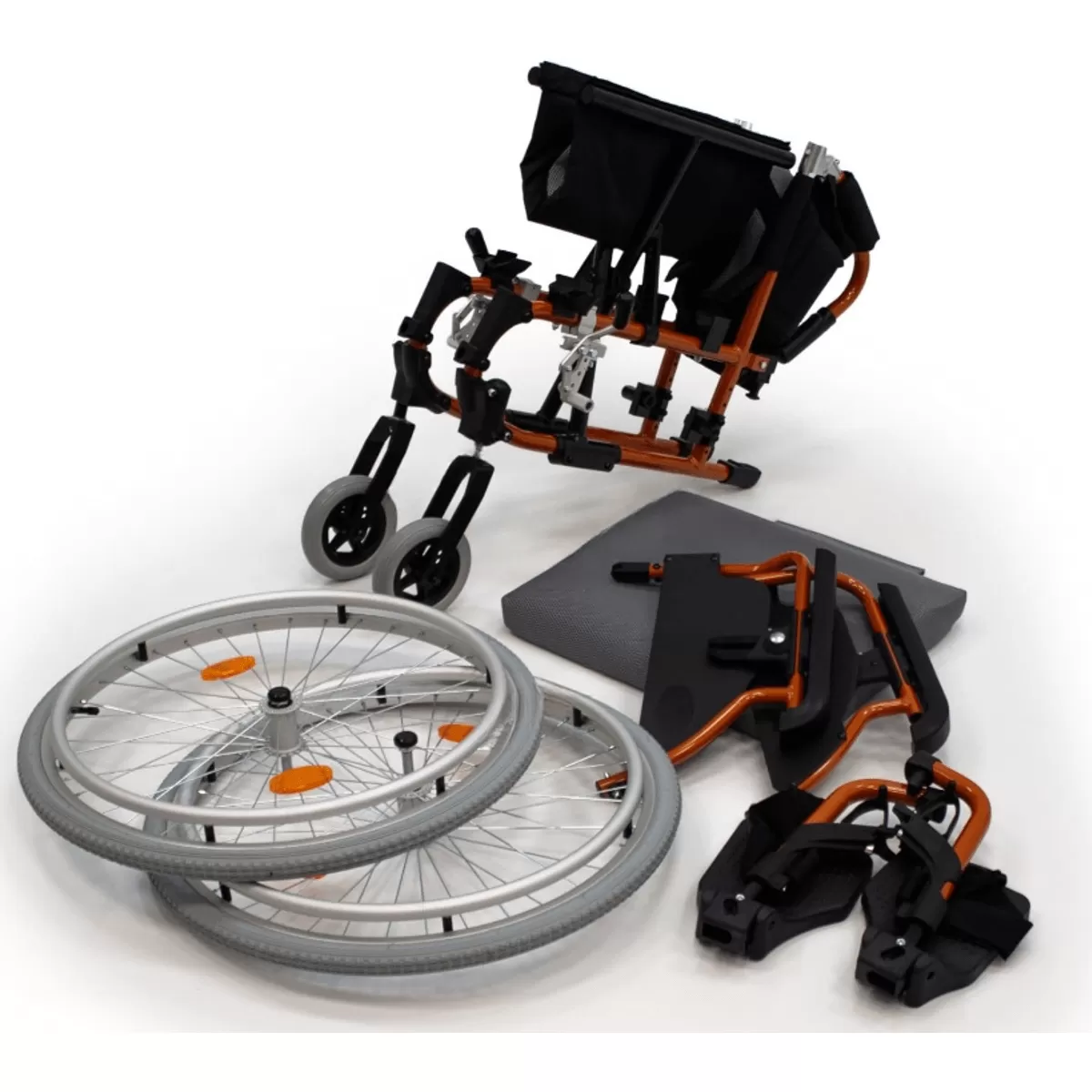 - Приводные колеса с быстросъёмными механизмами во втулках: литые цельнорезиновые в комнатной модификации. пневматический задние и передние в прогулочной модификации