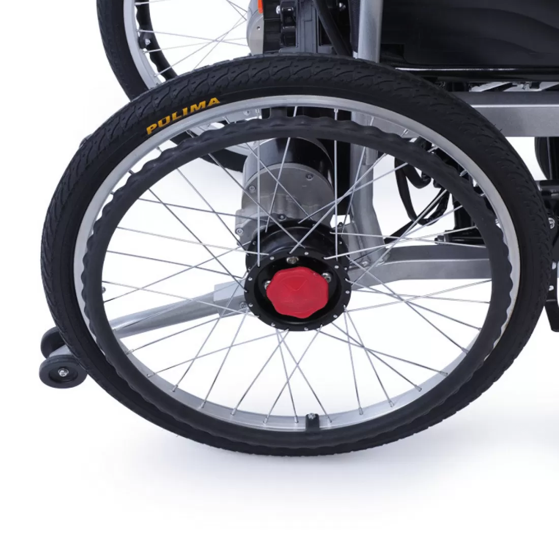 Электроприводная кресло-коляска со съёмным удлинением спинки, которая позволяет использование лицами с повреждениями шейного отдела позвоночника и оправдает себя при наличии хороших прогнозов на реабилитацию. Съёмные задние колёса диаметром 530 мм оснащены приводными ободами для энергонезависимого перемещения.Кресло-коляска электрическая оборудована задним приводом, реализованным в виде двух независимых электромоторов на безугловом редукторном соединении с ведущими колёсами. Такой тип электропривода наиболее надёжен и прост в обслуживании, так как достигается максимальная простота механических соединений.