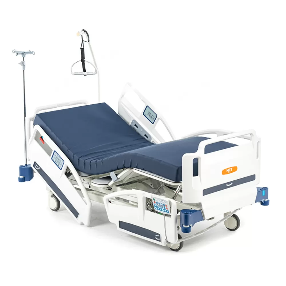 Надежная и проверенная конструкция рамы - на Y-образных рычагах, четырёхсекционное ложе с авторегрессией, конфигурация которого регулируется четырьмя бесшумными электроприводами от ведущего мирового производителя, двухсекционные боковые ограждения из полипропилена, обеспечивающие максимальную безопасность больного, быстросъёмные спинки с возможностью блокировки снятия.