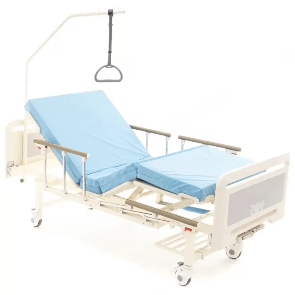 Медицинская функциональная кровать европейского качества исполнения, оборудованная четырёхсекционным ложем c вентиляционной перфорацией пластиковых ложементов и независимыми винтовыми регулировками положения секций.