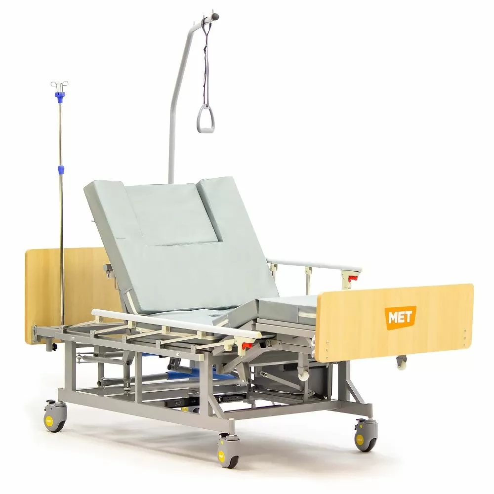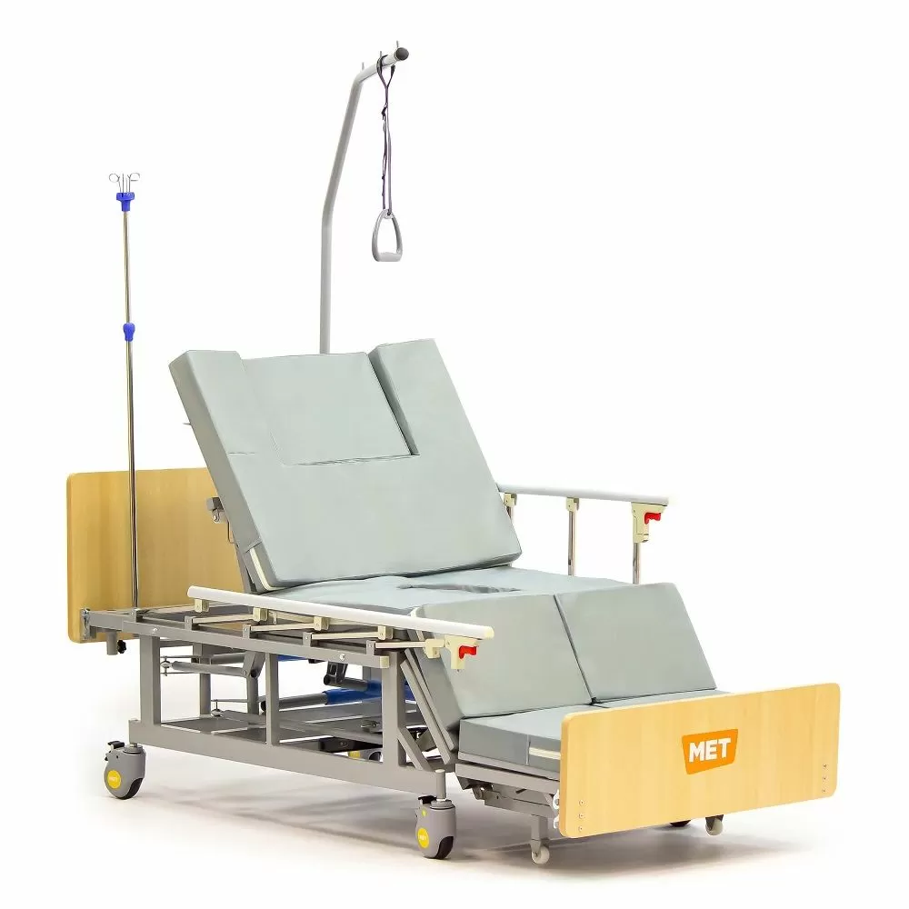 По краям кровати расположены специальные отверстия (4 штуки) для установки инфузионной стойки и других принадлежностей. В комплект входит инфузионная стойка, а также штанга для подтягивания больного с регулируемой по высоте рукояткой.