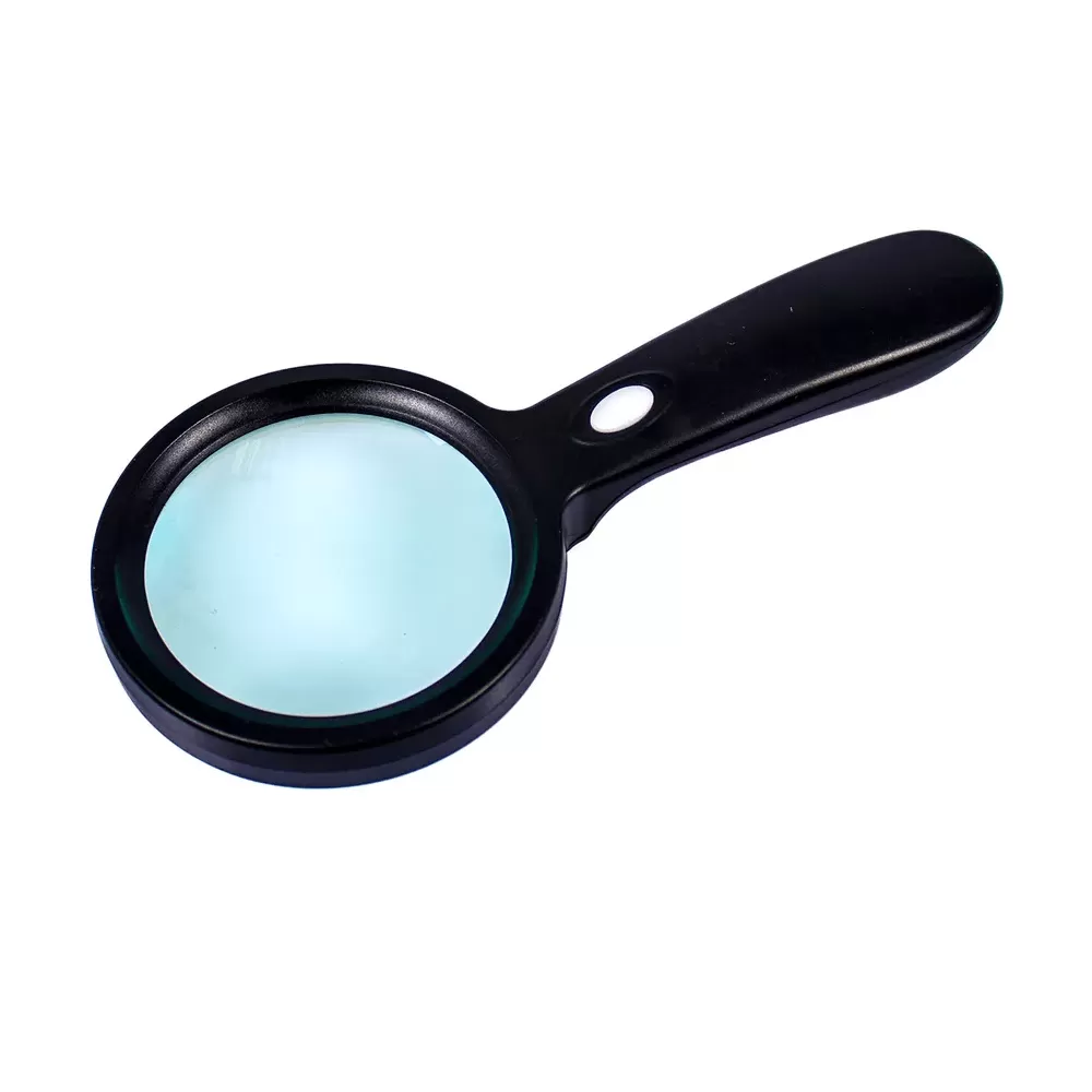 Лупа ручная круглая 10-кратная, диаметр 90 мм, со светодиодной подсветкой – 12 ярких светодиодов, расположенных возле линзы, при необходимости освещают объекты или читаемый текст.