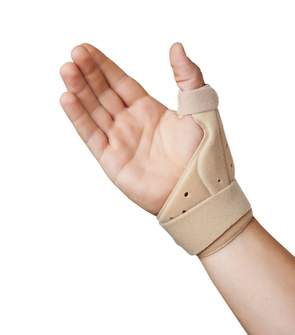 - Стабилизация фаланго-пястного сустава большого пальца за счет металлической V-образной шины и нерастяжимого материала, что позволяет использовать ортез вместо гипсовой повязки.