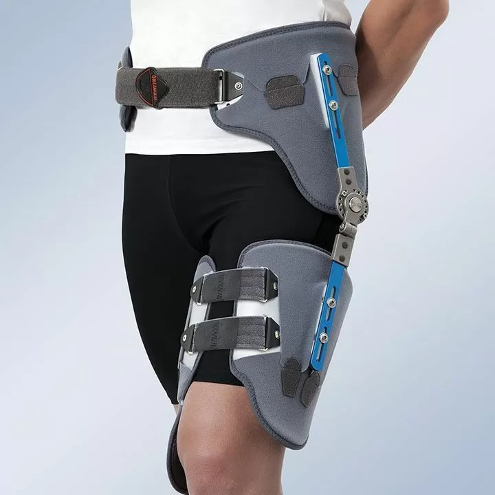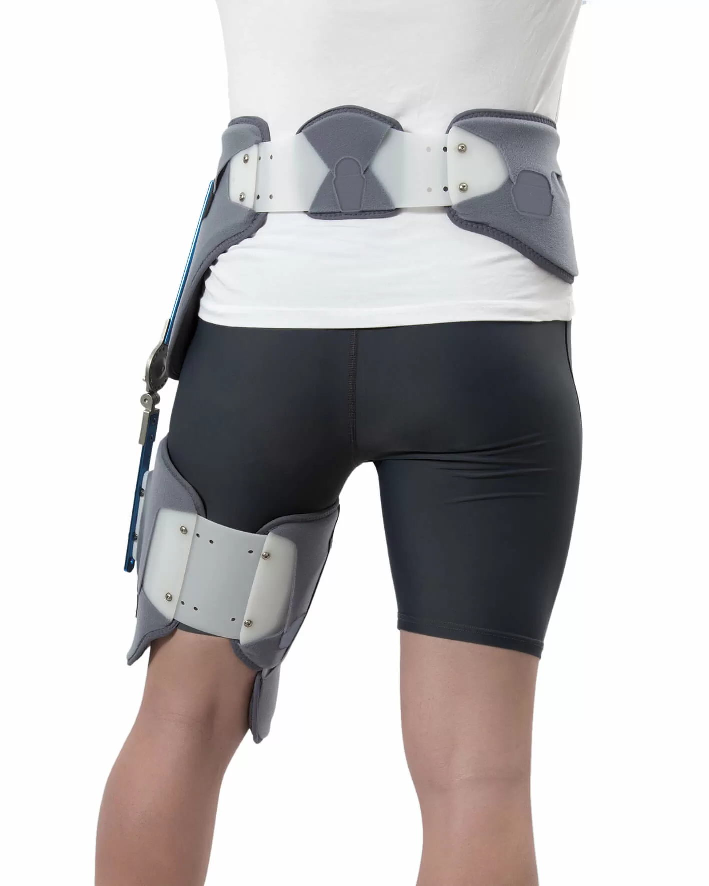 - Ограничивает или блокирует сгибание/разгибание тазобедренного сустава.