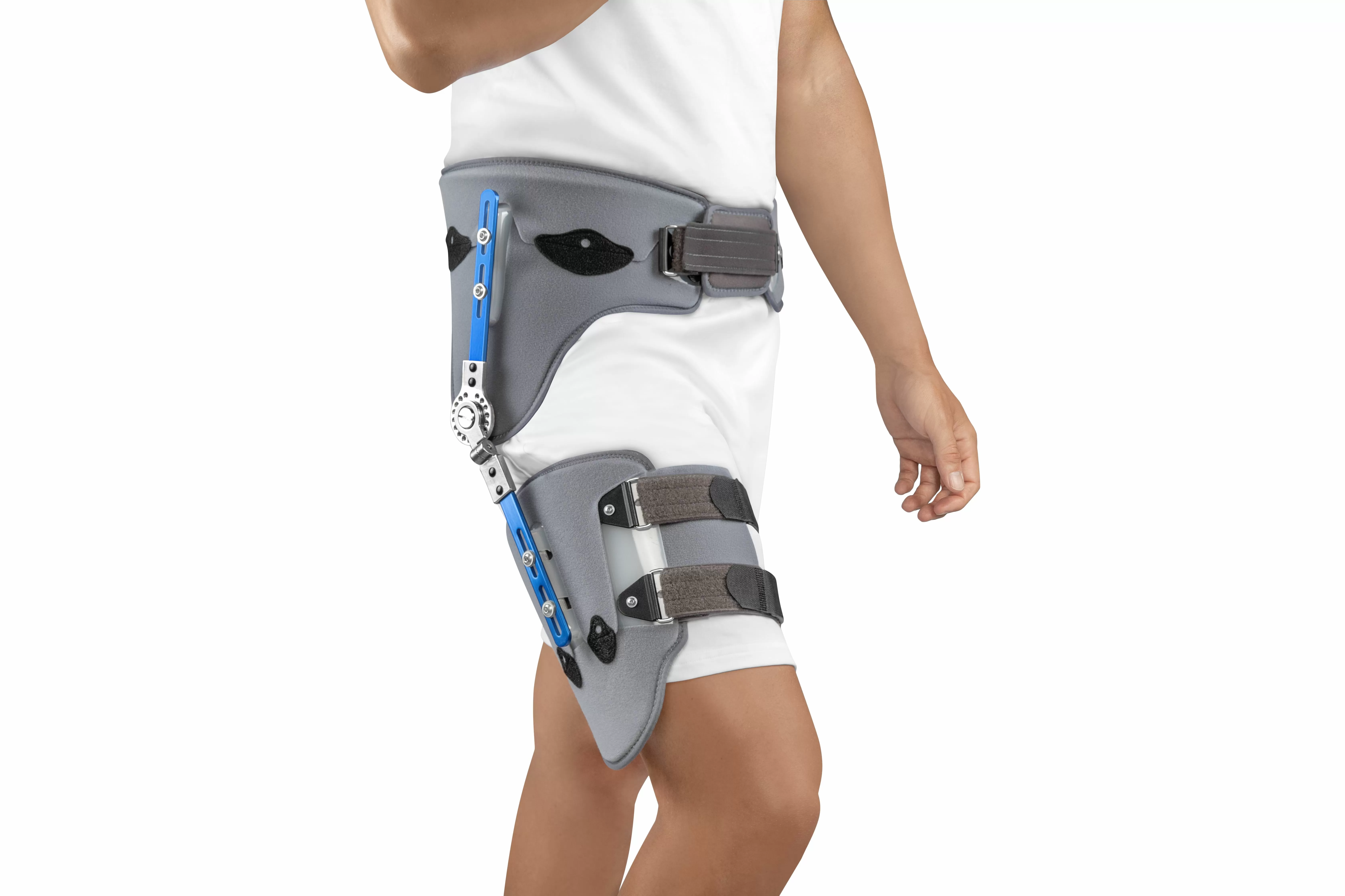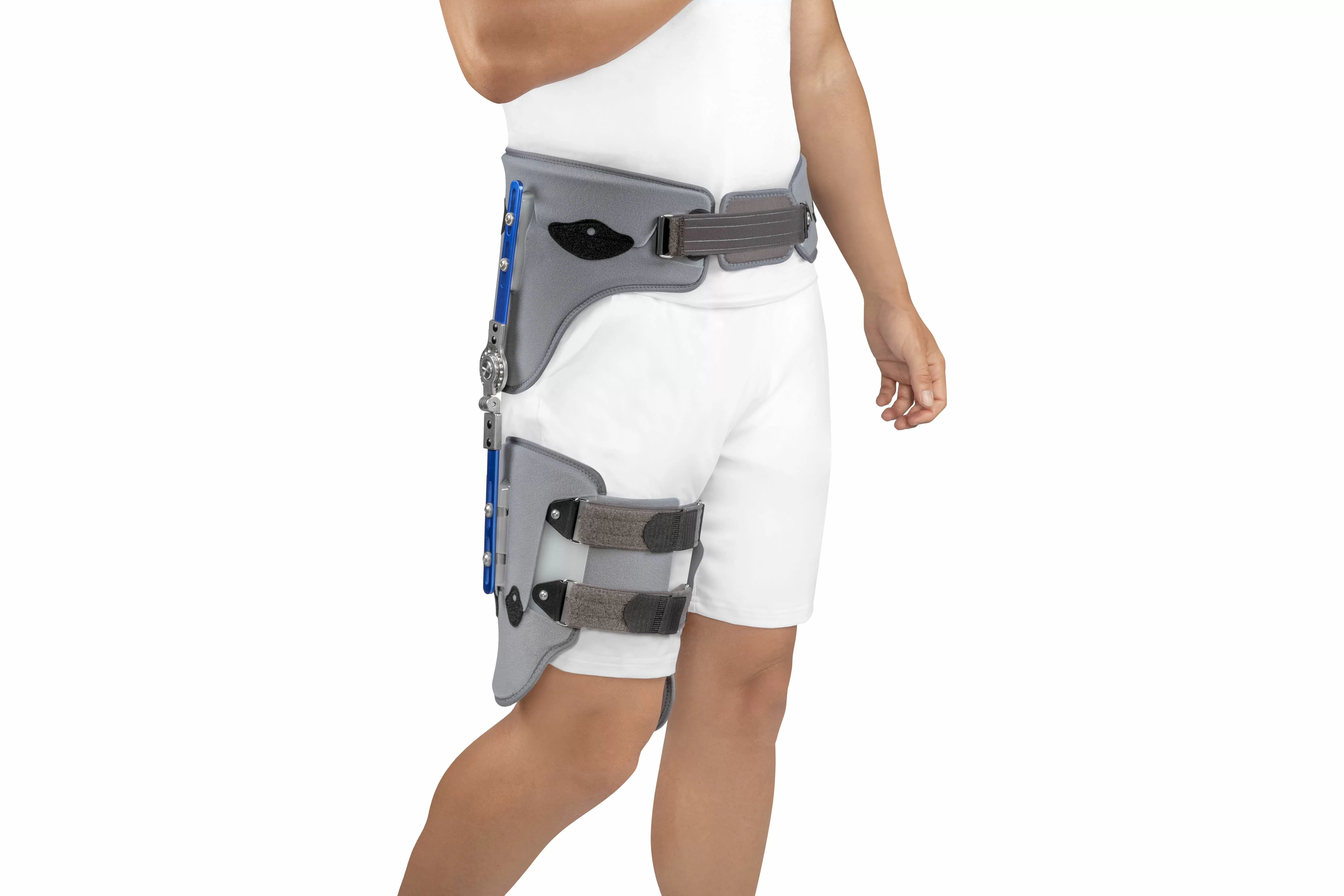 - Тазовая и бедренная части ортеза соединены при помощи металлических ребер жесткости и шарнира.