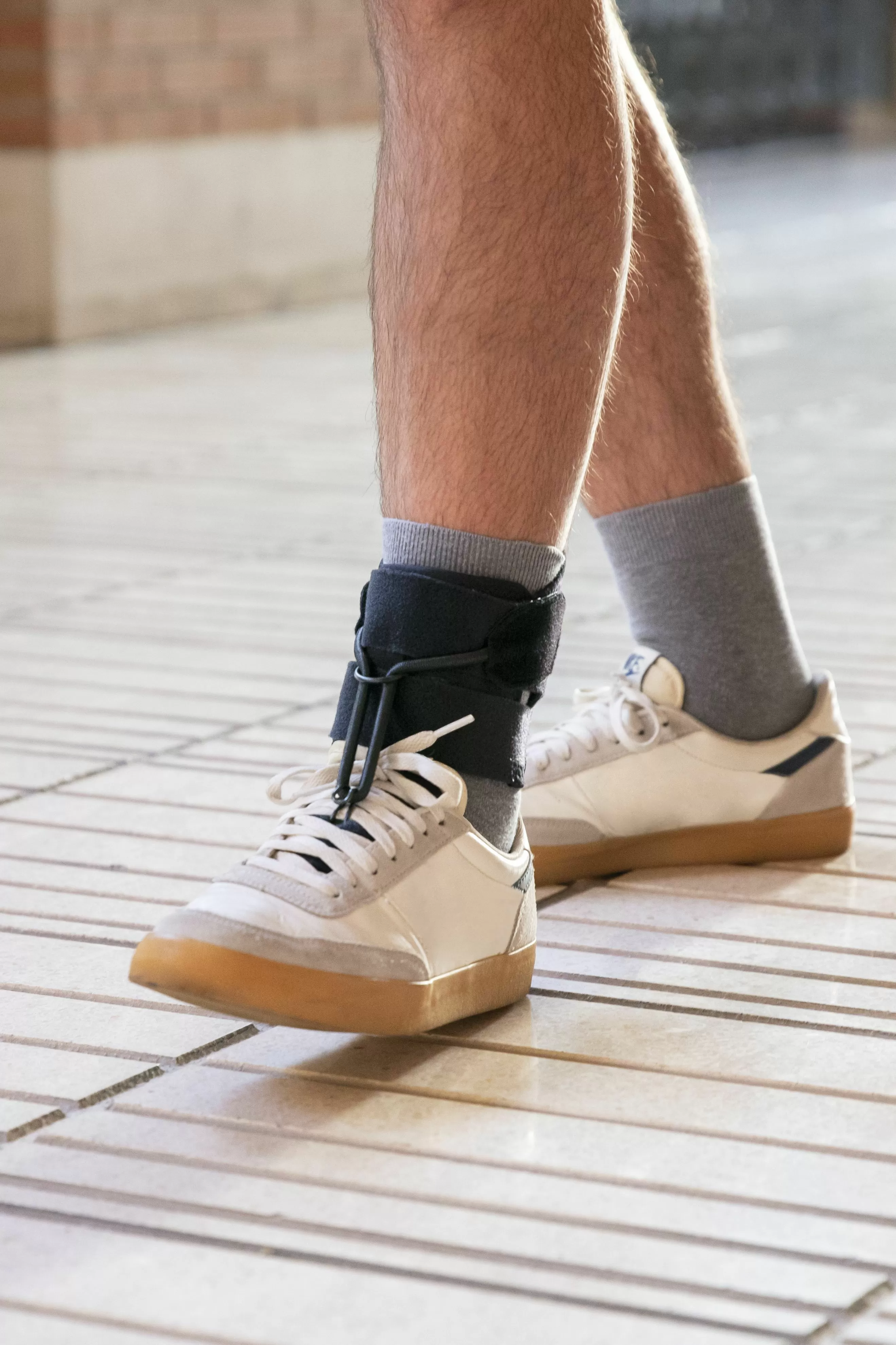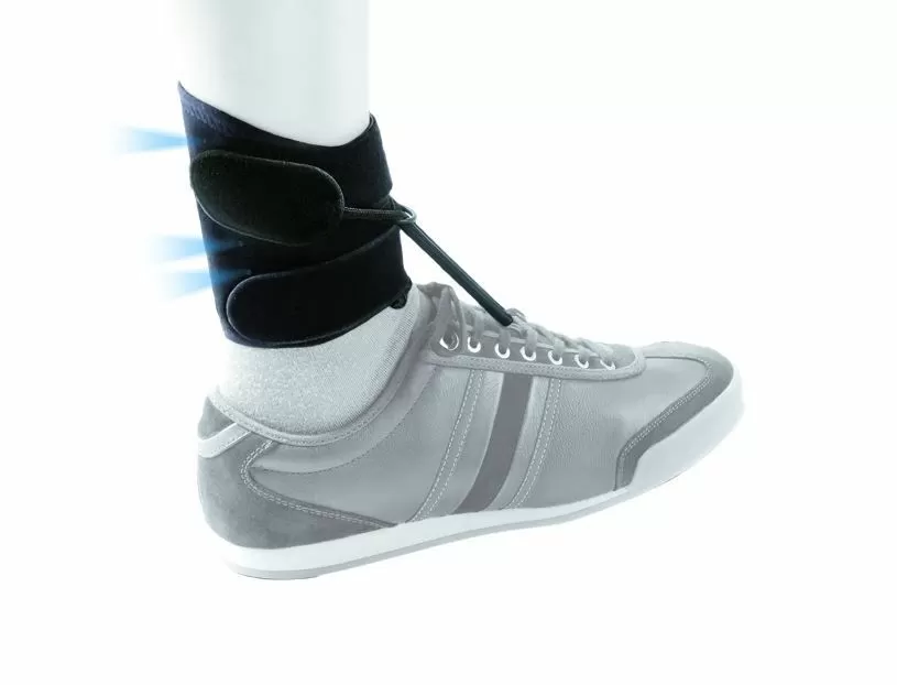 - Бандаж на лодыжку и часть, которая крепится к шнуровке обуви, соединены эластичным шнурком -> Поднимает средний и передний отделы стопы -> Ступня остается в среднем положении и не цепляется за землю во время фазы переноса конечности, что помогает избежать падения пациента.