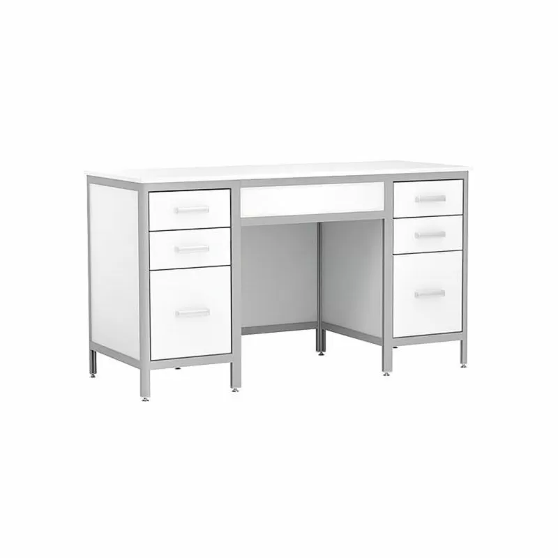 - Стол имеет 2 тумбы, каждая с 3-мя выдвижными ящиками на роликовых направляющих Метабокс, которые выдерживают нагрузку до 10 кг