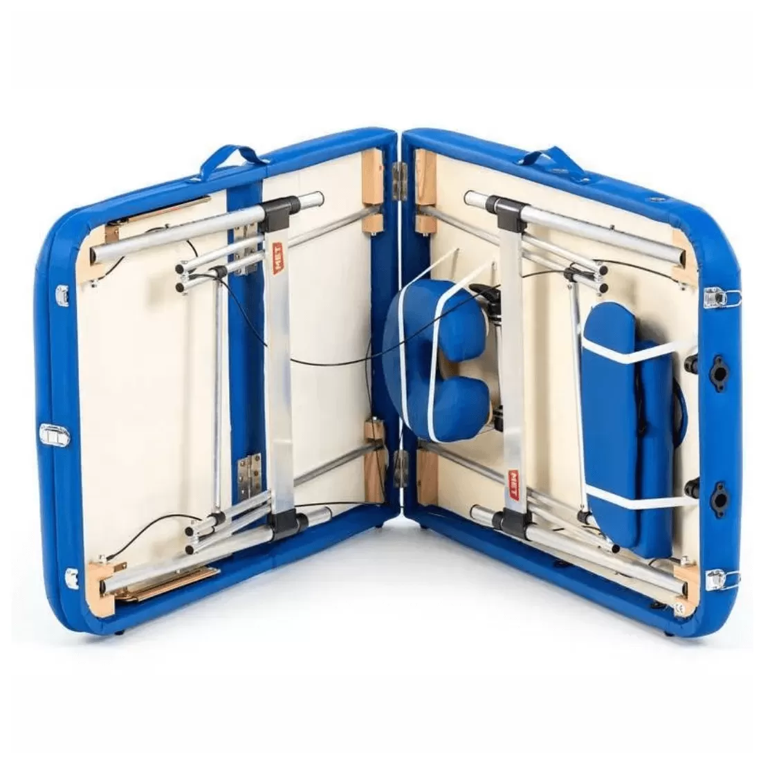 Массажный стол обладает лёгким и прочным алюминиевым каркасом с телескопической регулировкой высоты ножных опор, позволяющими устанавливать стол на удобной для пациента и врача высоте. Виниловое покрытие ложа с ППУ-наполнением выполнено из винилискожи синего цвета.