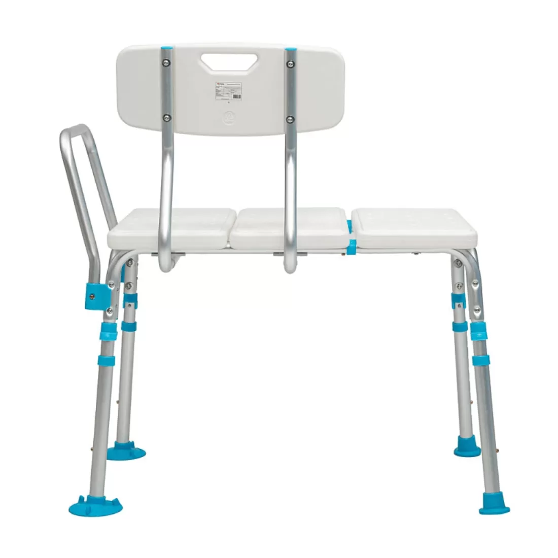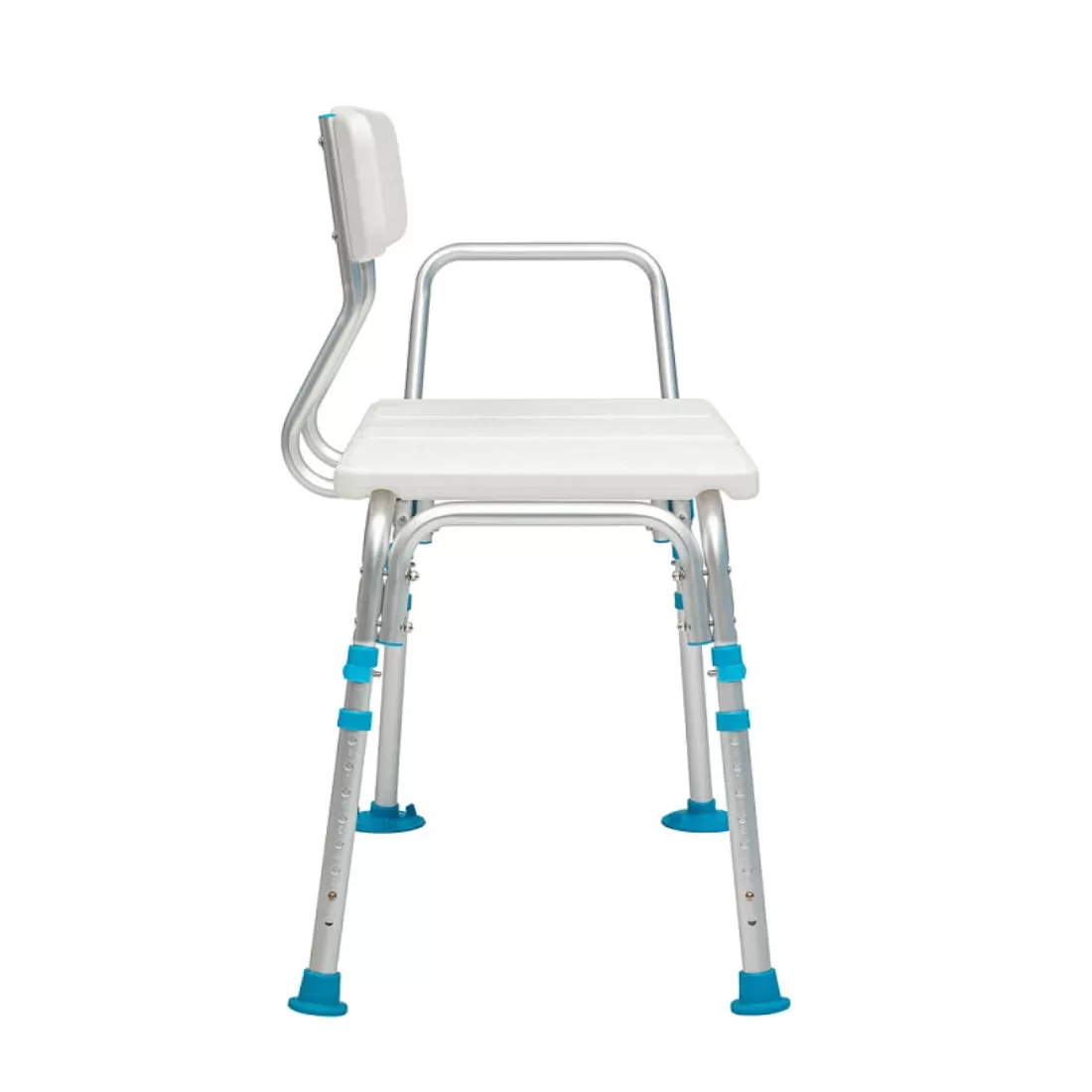 Стул оснащен быстросъемным подлокотником для дополнительной опоры, а также переставной спинкой, которую возможно установить в зависимости от расположения ванны или душевой кабины.