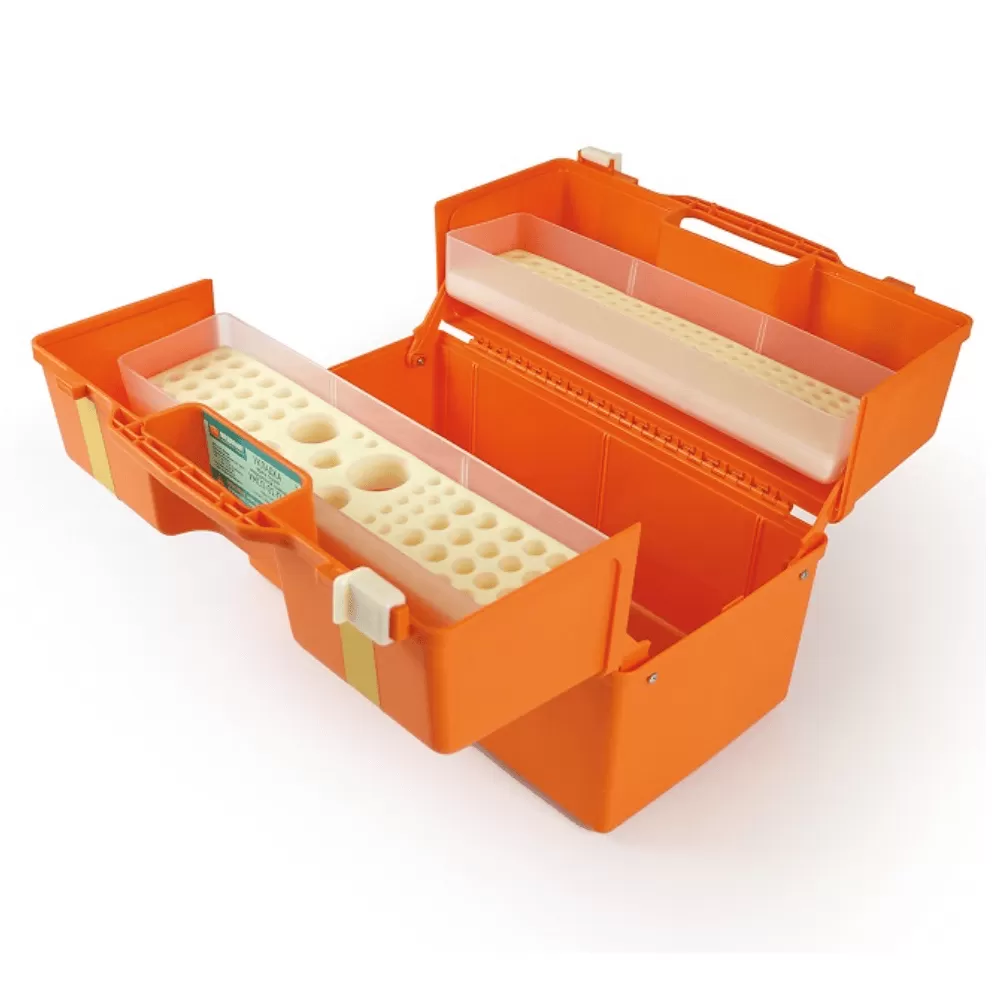 Укладка медицинская представляет собой пластиковый саквояж из высокопрочного холодо- и теплостойкого пластика. Чемодан скорой помощи оранжевого цвета, имеет удобные, вандалопрочные ручку и замки, исключающие его открытие при транспортировке. Дно укладки скорой помощи прочное, износостойкое. Верхняя часть футляра выполнена в виде створок, открывающихся в стороны, в створках установлены лотки с ложементом для ампул и флаконов антисептиков. Створки крепятся к дну надёжными петлями со стальным стержнем внутри. При открытии медицинского ящика обеспечена постоянная вертикальная ориентация лотков и удобный доступ к содержимому лотков и дна футляра. Открытая медицинская укладка, по существу, является комфортным, рабочим местом. Ложемент обеспечивает полный набор мест для ампул, ампулы ориентированы вертикально, не «звенят» и не бьются. На верхней поверхности медицинской укладки имеется бирочное окошко для обозначения номера бригады или названия набора. Незаменима для муниципальных линейных бригад СМП с большой интенсивностью вызовов.
