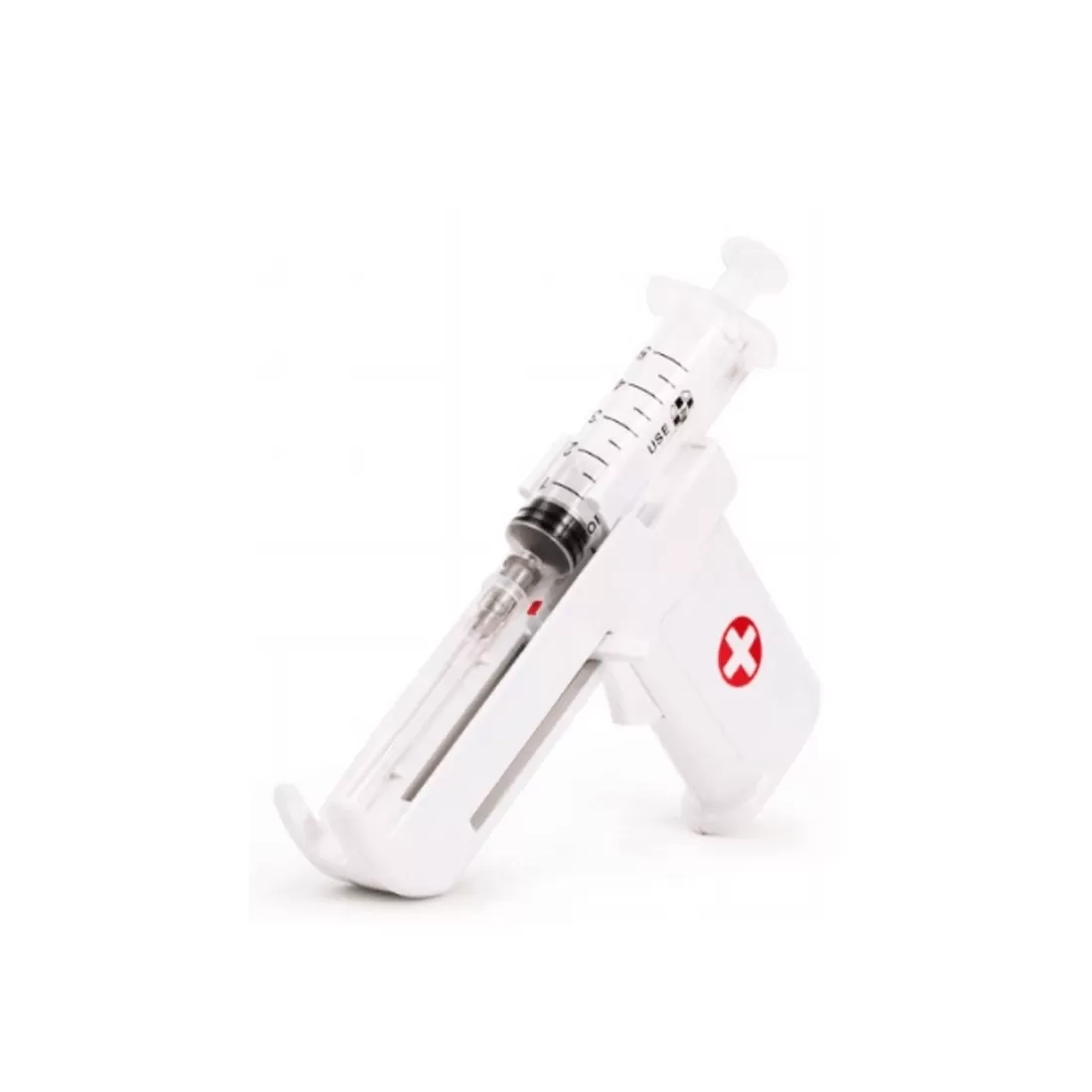 - Обработайте место инъекции дезинфицирующим средством и установите шприц-пистолет на расстоянии 2-3 мм от кожи под углом 90 градусов. Резко нажмите на курок - игла войдет в мышцу.