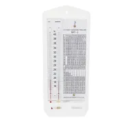 На пластмассовом основании закреплены два термометра, температурная шкала, психрометрическая таблица и стеклянный питатель. Термометрическая жидкость ― толуол.